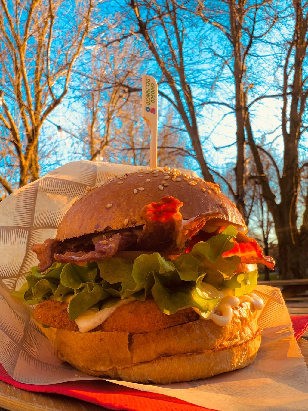 Chicken Bacon: Cotoletta di pollo*, edamer, bacon croccante, insalata, pomodoro, maionese, pane artigianale Buns.