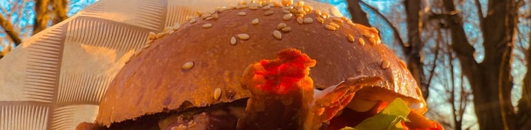 Hamburger farcito: Hamburger di manzo*, edamer, insalata, pomodoro, maionese, salsa barbecue, pane artigianale Buns.
