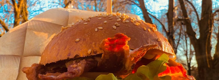 Bacon Burger: Hamburger di manzo*, edamer, bacon croccante, insalata, pomodoro, maionese, salsa barbecue, pane artigianale Buns.